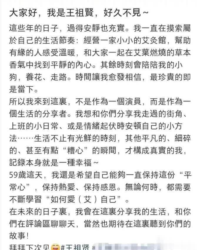王祖贤在2026年1月31日迎来生日,当天她在社交平台发布内容,公开这些年的生活状态。她在文中提到,日子过得安静且充实,一直在探索属于自己的生活方式,包括经营艾灸馆的事业。她表示,通过这份工作,帮助前来的人感受到温暖,并在艾叶燃烧的香气中寻求内心的平静。剩余时间,她陪伴宠物狗,进行养花和散步活动。她强调,最珍贵的是当下时刻,并来到平台不是以演员身份,而是作为生活分享者。