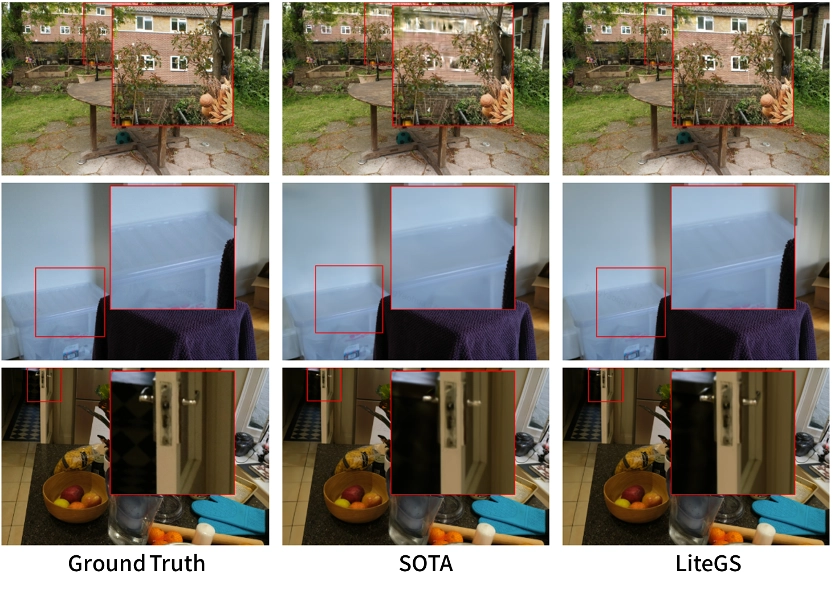 在相同参数量下,LiteGS 在 PSNR 指标上超出主流方案 0.2–0.4 dB,训练时间缩短 3.8 至 7 倍。