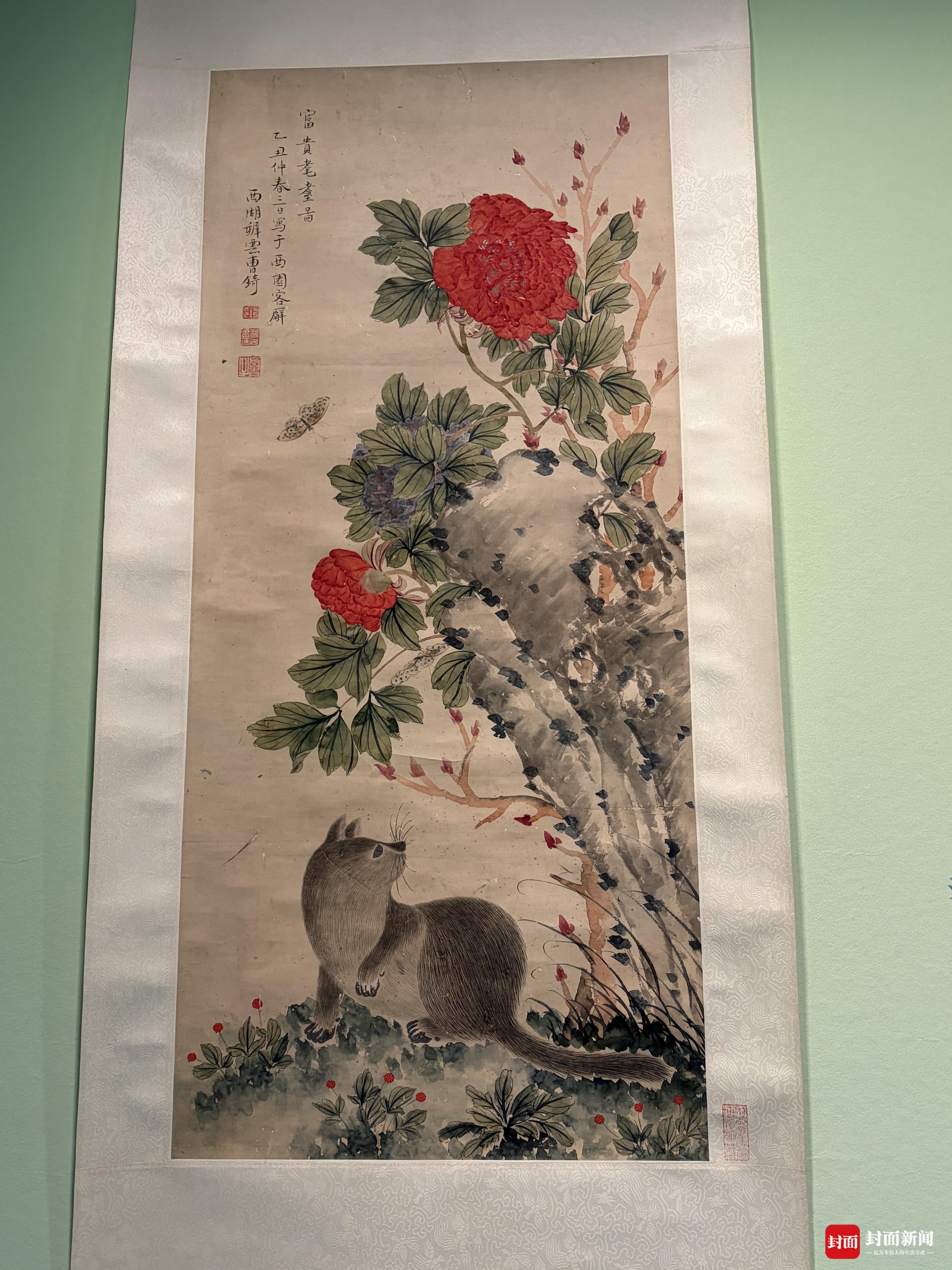 来到这样一场满是美好寓意的展览中,自然要细细欣赏其中的精美文物。采访中,樊博琛特别介绍了几件颇具代表性的文物。其中,亮相第一单元的成都武侯祠博物馆藏清代曹锜所绘《富贵耄耊图》卷轴堪称经典,画面中猫栖于牡丹花丛与假山之间,数只蝴蝶翩跹戏耍,左上角“富贵耄耋”四字点明主旨——牡丹象征富贵,“猫”谐音“耄”,“蝶”谐音“耋”,巧妙融合自然物象与谐音寓意,既展现了清代花卉画的精湛技法,又传递出对长者长寿安康的美好祝愿,是天府文化中吉祥寓意表达的典型代表。