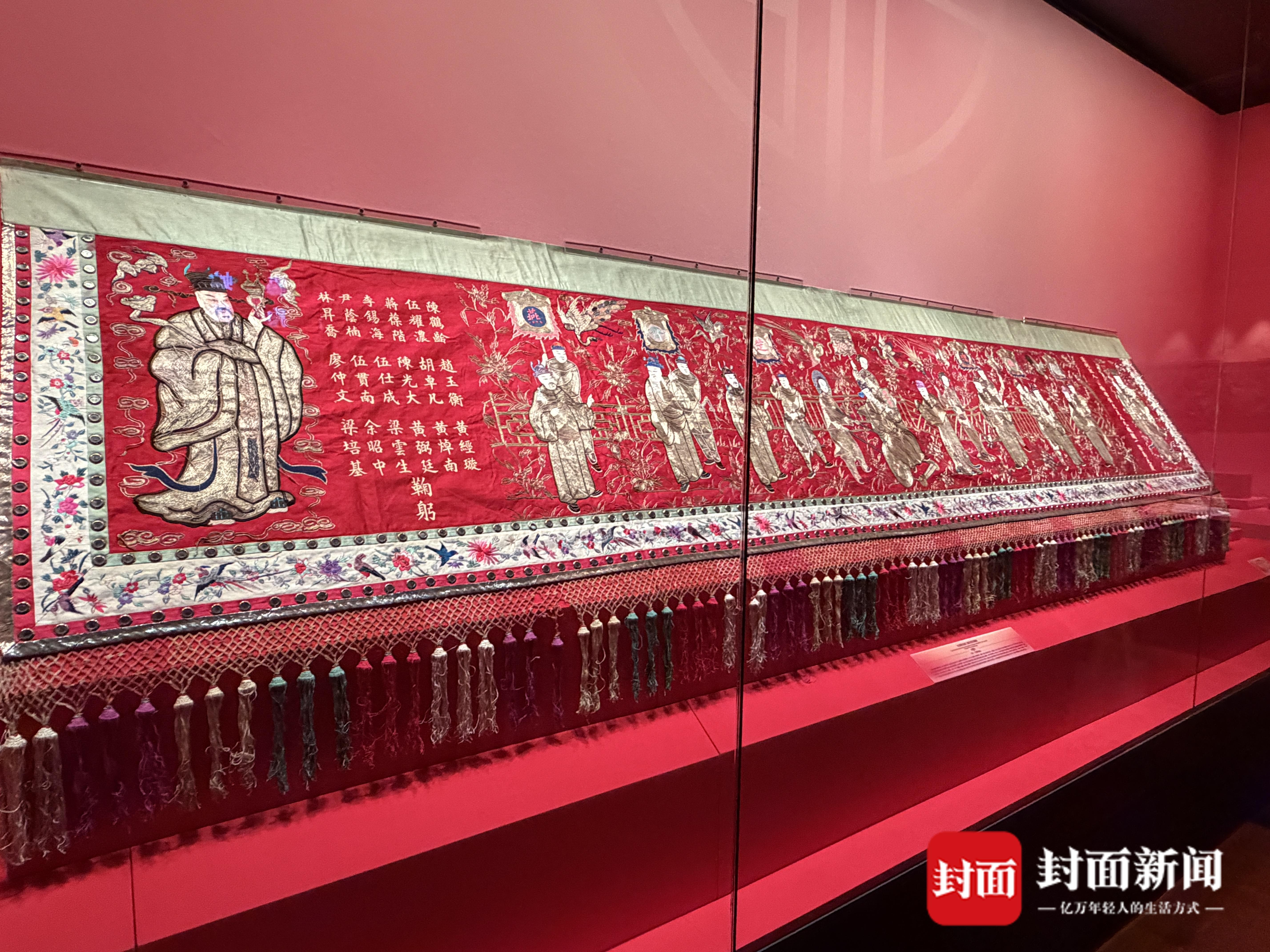 此外,还有广州博物馆的红缎排金绣人物纹贺寿横幅,更是明艳喜庆。该文物以大红缎为地,大量运用盘金绣工艺,横幅上共有十九个人物形象,两侧为禄星,被赋予祝寿寓意,“这件文物体量较大,长4米、高1米,是首次对公众进行展出,也全面展示了广州地区拜寿习俗中的美好寓意。”