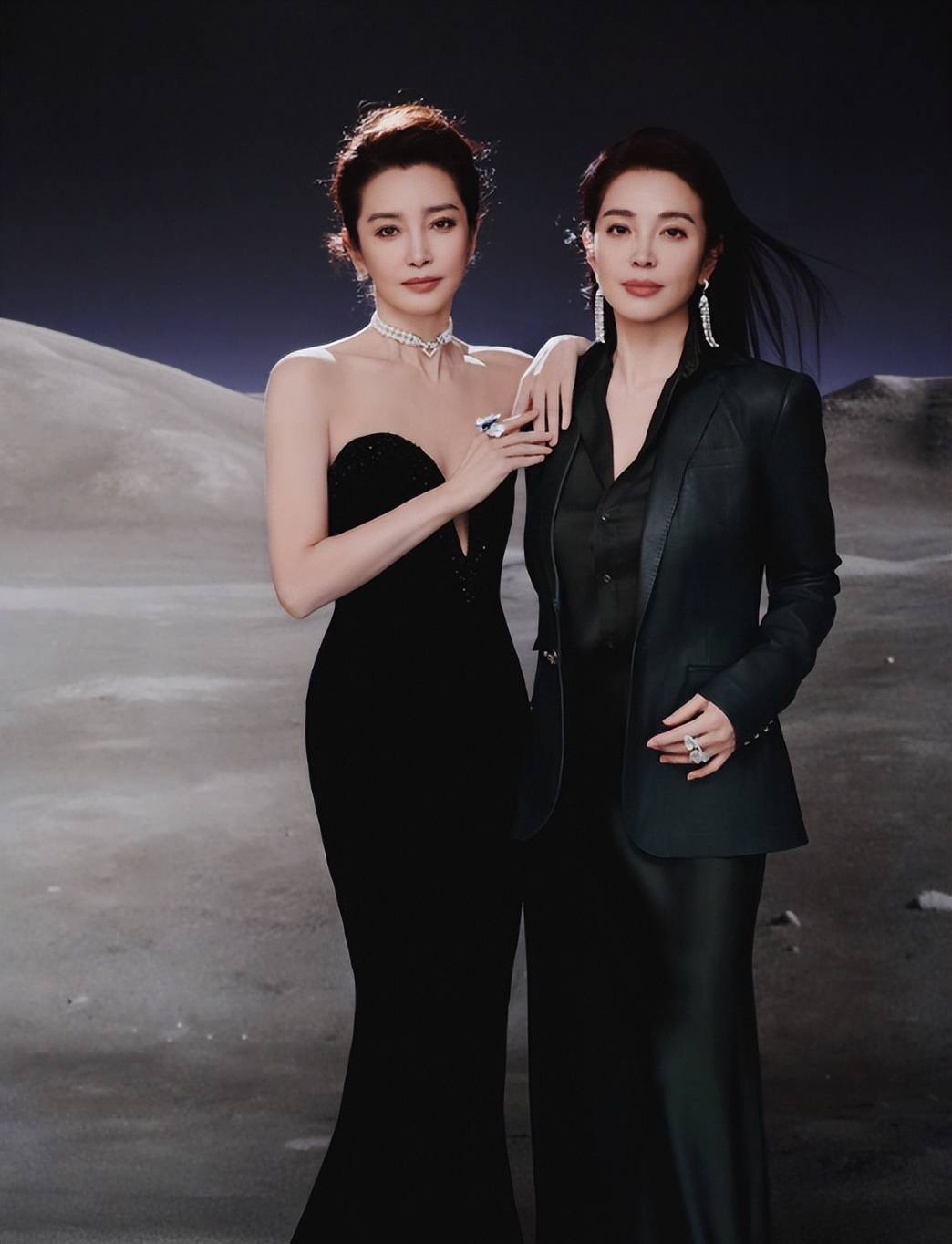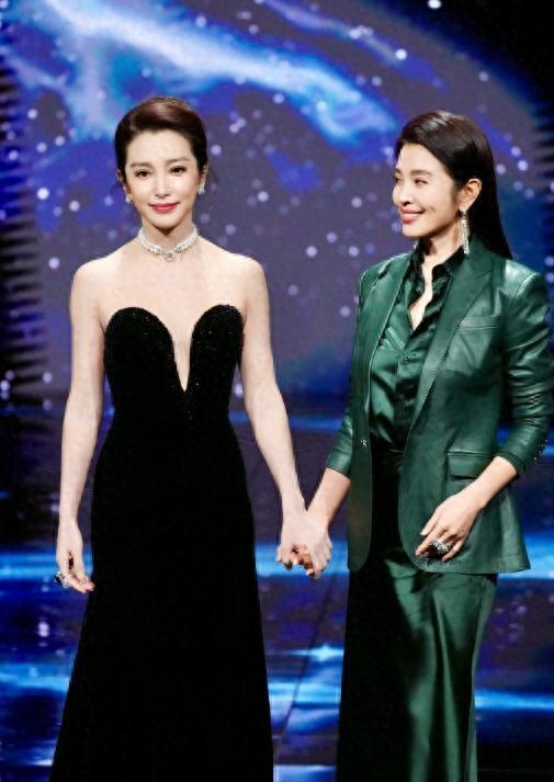 李冰冰一袭黑色晚礼服,李雪一身墨绿色套装,刷新了人们对于50岁女性的刻板印象。