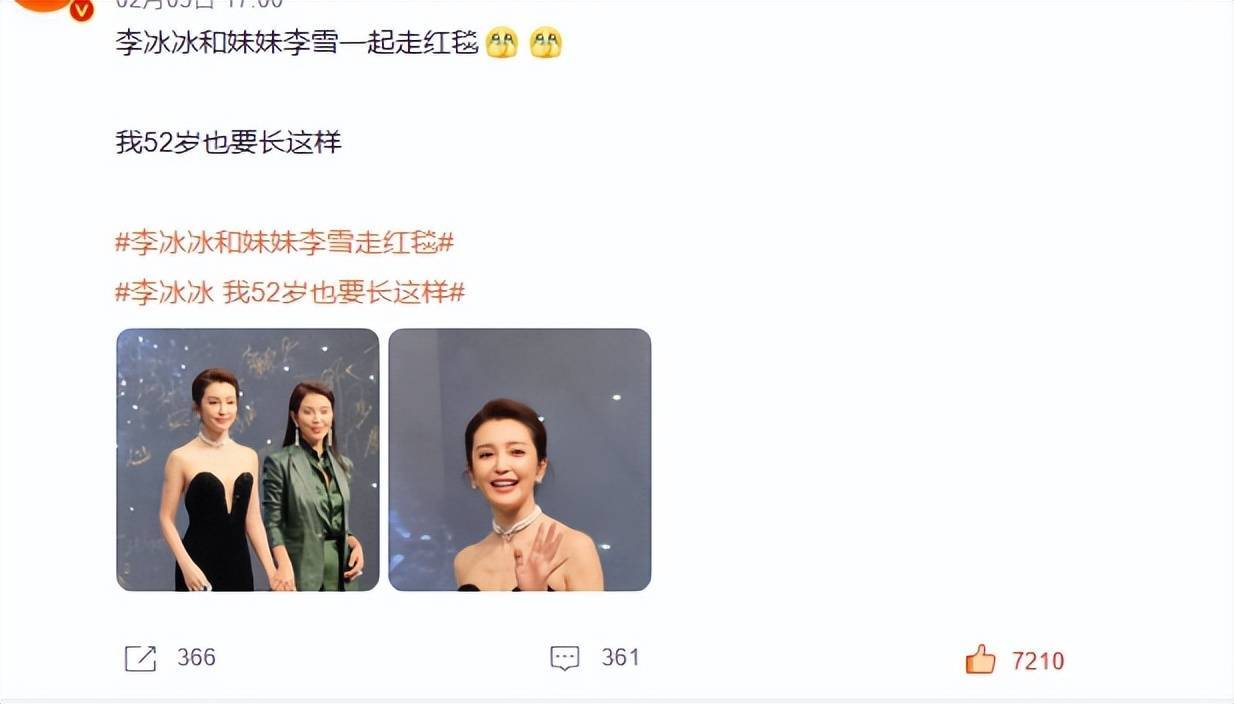 微博之夜的红毯上,李冰冰携自己的妹妹兼经纪人李雪一同现身,直接拉爆热搜。